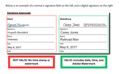 Particularly with Adobe Acrobat Sign, it can be hard to tell if the e-signature is a valid digital signature. Valid digital signatures from Adobe will include the Adobe watermark, as well as the date AND time information of your signature. Here is a side-by-side comparison: